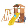 Игровая площадка изготовлена из клееного соснового бруса и массива сосны .Дерево обработано безопасной декоративно-защитной пропиткой. Технология значительно увеличивает срок службы конструкций, повышает прочность древесины, защищает её от гниения и грибков.