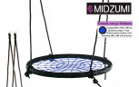 Качели-гнездо Midzumi выполнены из металлической рамы диаметром 60 сантиметров, с дополнительной защитной оплеткой ее бортиков, обтянутых прочным синтетическим канатом толщиной 10 мм выдерживающим нагрузку 100 кг. Плетеное синтетическое сидение качелей удобное и практичное, не собирает грязь и воду, при сильных загрязнениях его можно протереть.