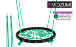 Качели-гнездо Midzumi выполнены из металлической рамы диаметром 80 сантиметров, с дополнительной защитной оплеткой ее бортиков, обтянутых прочным синтетическим канатом толщиной 10 мм выдерживающим нагрузку 100 кг. Плетеное синтетическое сидение качелей удобное и практичное, не собирает грязь и воду, при сильных загрязнениях его можно протереть.